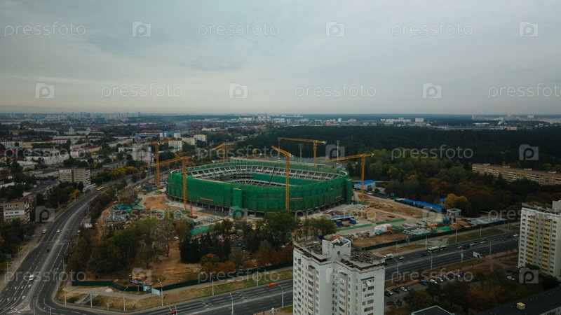 Строительство стадиона в большом городе. Строительная площадка среди городских районов. Аэрофотосъемка