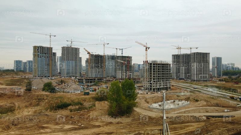Строительная площадка нового городского квартала. Строительство многоэтажных домов. Пасмурная погода. Аэрофотосъемка