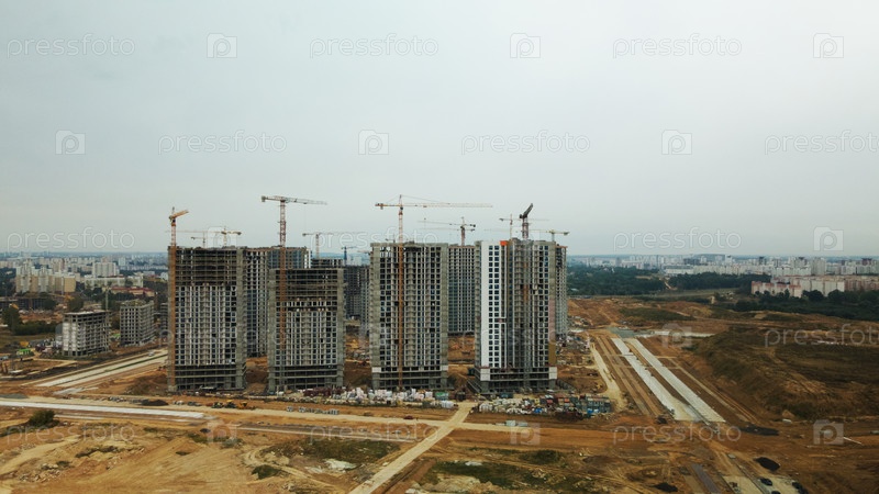 Строительная площадка нового городского квартала. Строительство многоэтажных домов. Пасмурная погода. Аэрофотосъемка
