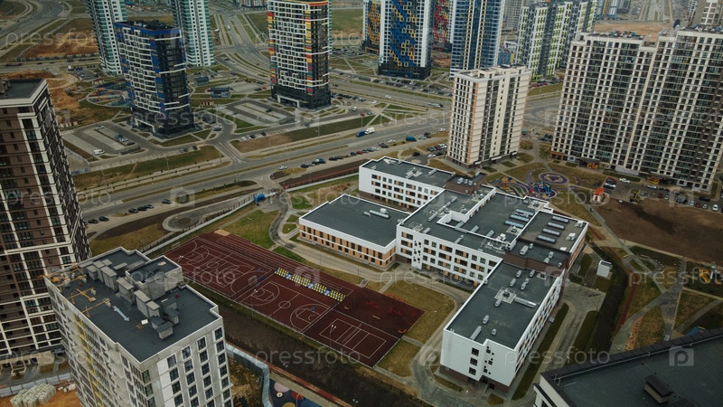 Современная городская архитектура. Многоэтажные дома с инфраструктурой. Густонаселенная городская территория. Пасмурная погода. Аэрофотосъемка