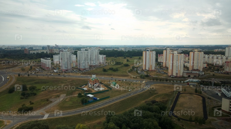 Спальный район большого города. Строительная площадка церкви. Городской ландшафт. Аэрофотосъемка