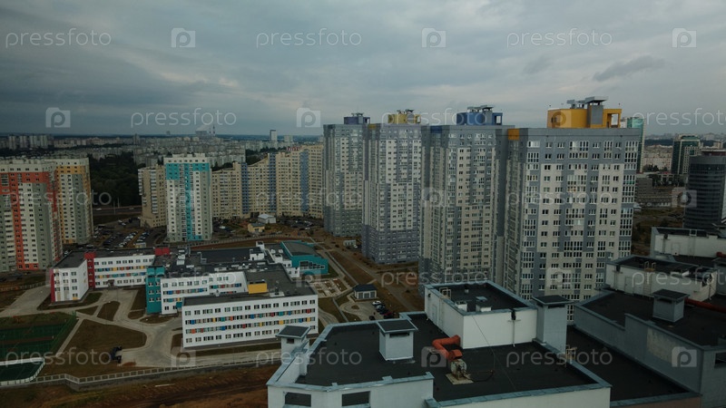 Современная городская архитектура. Многоэтажные дома с инфраструктурой. Густонаселенная городская территория. Пасмурная погода. Аэрофотосъемка