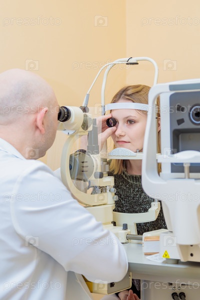 Мужчина-офтальмолог проверяет зрение молодой девушки с помощью современного устройства со световым лучом