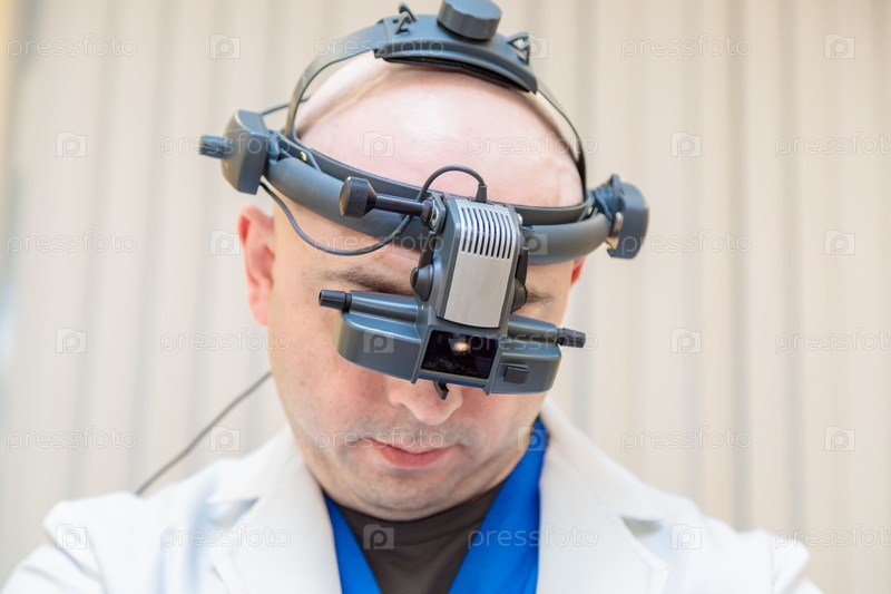 Мужчина-офтальмолог проверяет зрение пациента с помощью бинокулярного офтальмоскопа