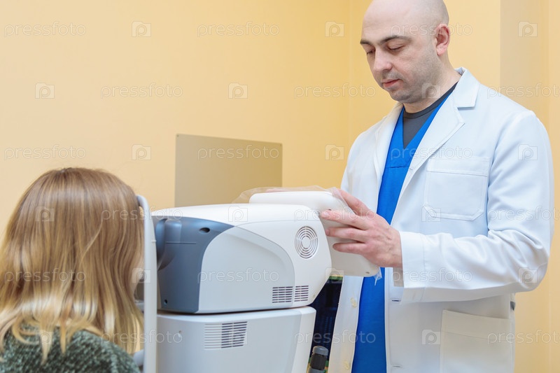 Мужчина-офтальмолог проверяет зрение молодой девушки с помощью современного тестера зрения