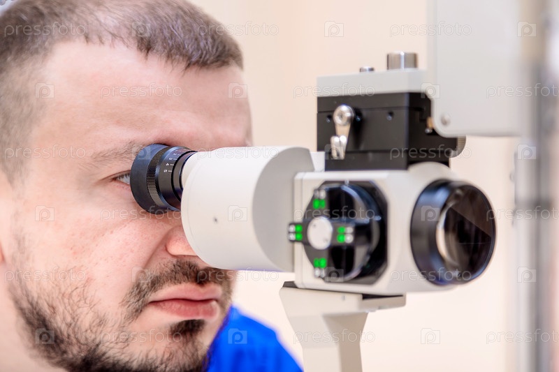 Мужчина-офтальмолог проверяет зрение пациента с помощью современного устройства со световым лучом