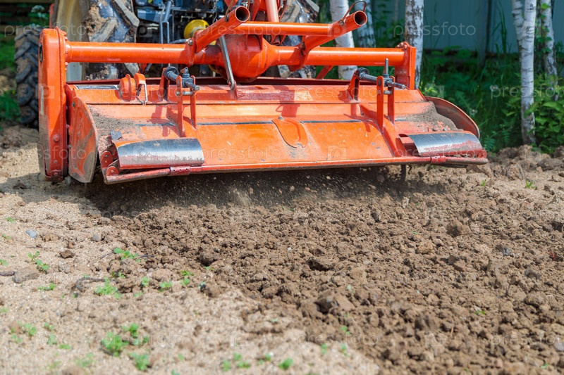 Культиватор для мини-трактора для рыхления почвы. Сельскохозяйственные работы. Земляные работы. Крупный план