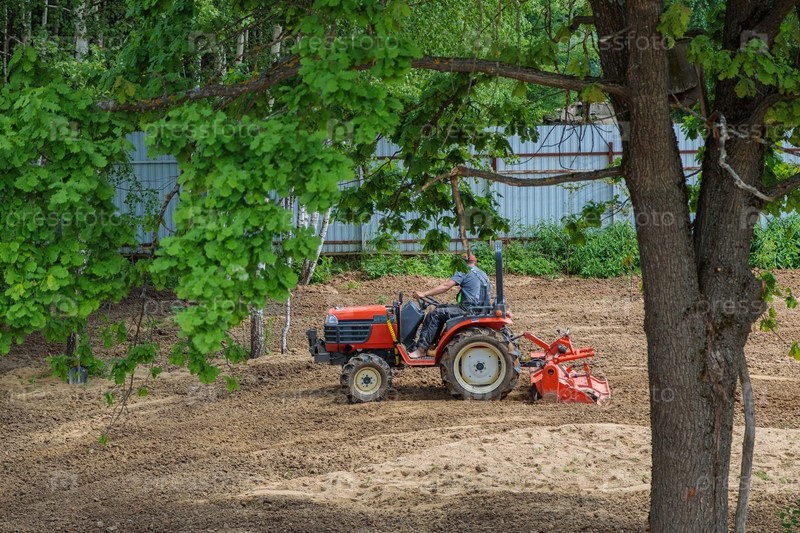 Фермер на минитракторе рыхлит почву для газона. Обработка земли, выравнивание поверхности