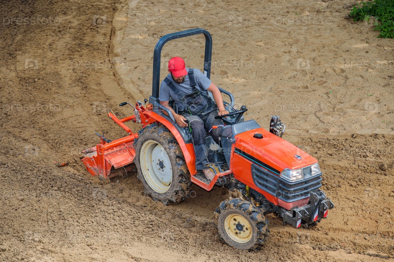 Фермер на минитракторе рыхлит почву для газона. Обработка земли, выравнивание поверхности