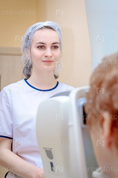 Девушка-оптометрист осматривает глаза пациента с помощью специального современного оборудования