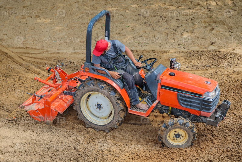 Фермер на минитракторе рыхлит почву для газона. Обработка земли, выравнивание поверхности