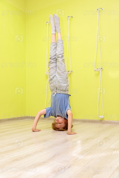 Мальчик стоит на руках в спортзале у стены. Ребенок занимается йогой, делает стойку на голове