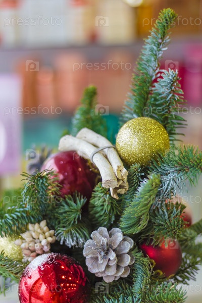Рождественские яркие шары на ветках елки. Традиционный праздник нового года