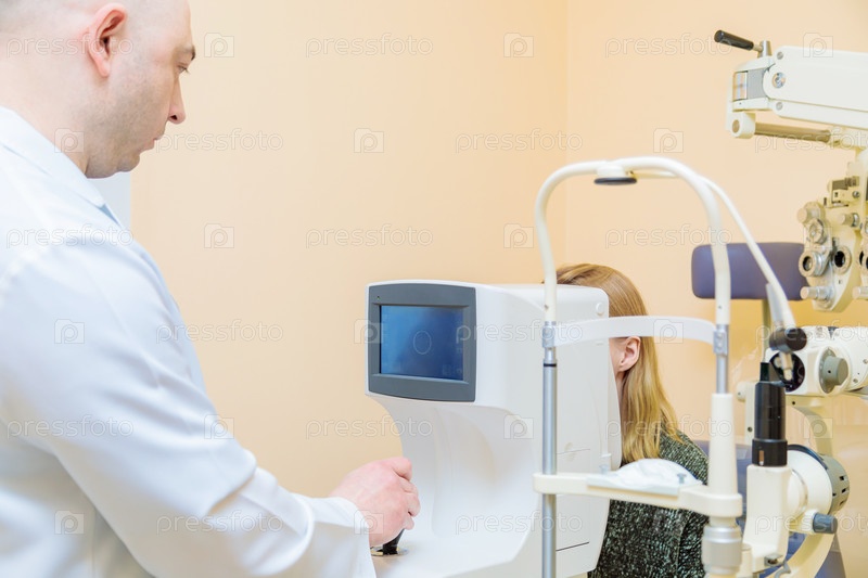Мужчина-офтальмолог проверяет зрение молодой девушки с помощью современного тестера зрения