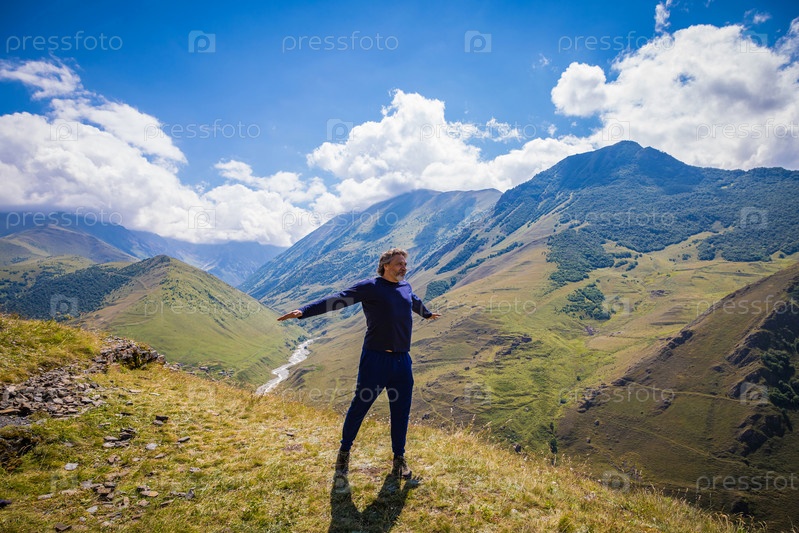 Мужчина стоит на вершине горы с раскинутыми руками, Северная Осетия, село Камунта
