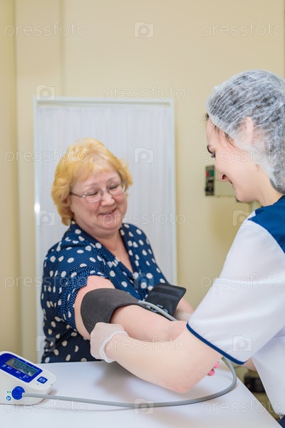 Медсестра в поликлинике измеряет артериальное давление женщине с помощью прибора. Здравоохранение