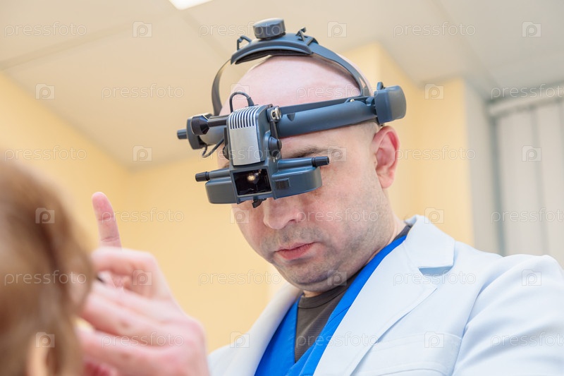 Мужской офтальмолог проверяет зрение взрослой женщины с помощью бинокулярного офтальмоскопа