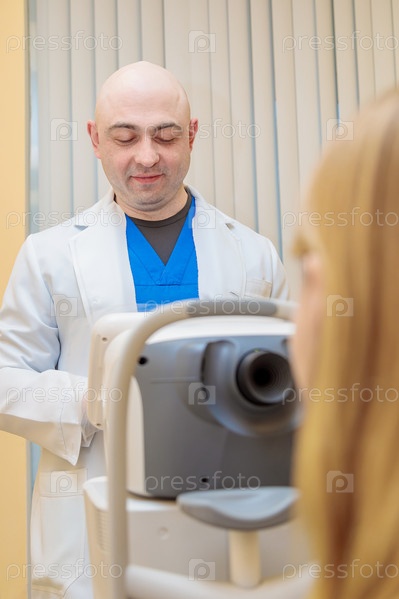 Мужчина-офтальмолог проверяет зрение молодой девушки с помощью современного тестера зрения