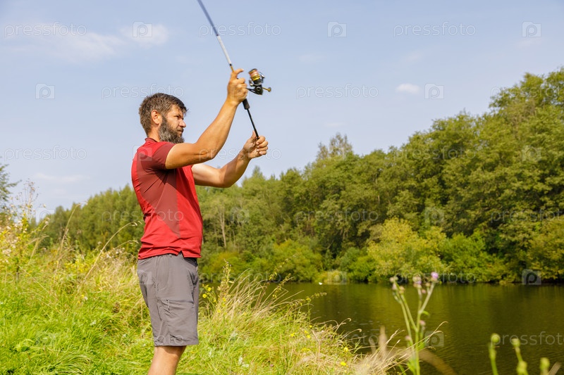 Мужчина с бородой ловит рыбу на реке, забрасывает удочку. Рыбак с удочкой ловит рыбу на берегу реки
