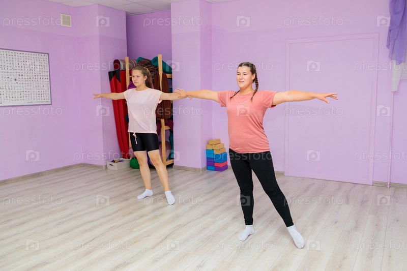 Девушка-инструктор по танцам показывает элементы номера другой девушке. Обучение танцам