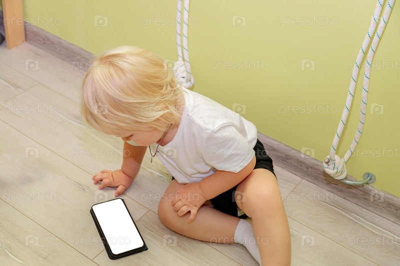 Маленький ребенок сидит на полу и смотрит на мобильный телефон. Малыш с белыми волосами смотрит на мобильный телефон