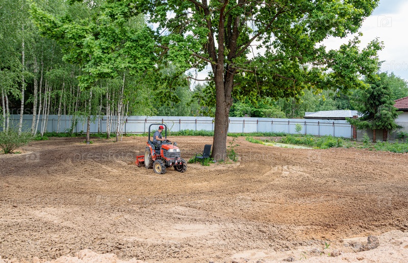 Мужчина на мини-экскаваторе разравнивает участок земли, рыхлит почву