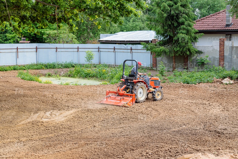 Мужчина на мини-экскаваторе разравнивает участок земли, рыхлит почву