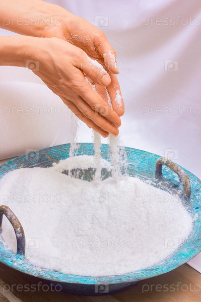 Женские руки насыпают морскую соль в синюю миску. Концепция ухода за кожей, исцеление