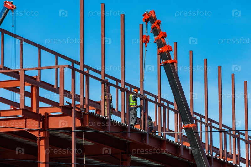 Строители закрепляют железные балки краном. Каркасная конструкция