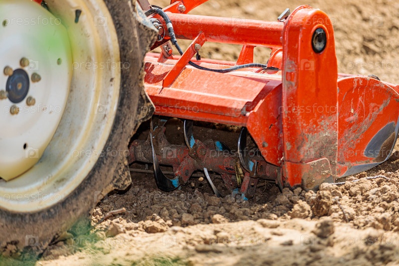 Культиватор для мини-трактора для рыхления почвы. Сельскохозяйственные работы. Земляные работы. Крупный план