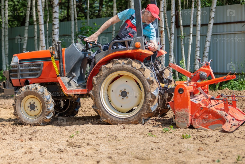 Фермер на минитракторе рыхлит почву для газона. Обработка земли, выравнивание поверхности