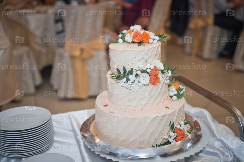 Красивый трехъярусный торт, украшенный яркими цветами