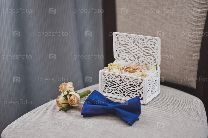 Обручальные кольца в стильной коробочке на подложке из бутонов роз