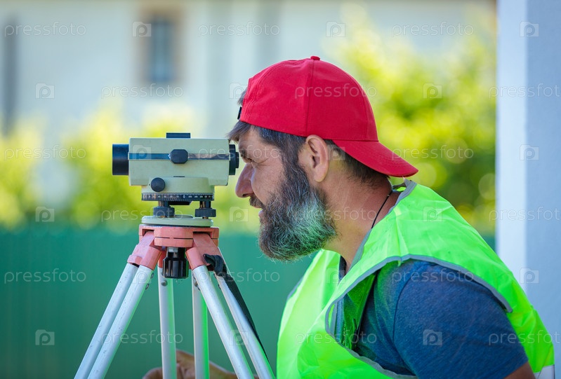 Мужчина работает с оптическим уровнем, чтобы выровнять ландшафт