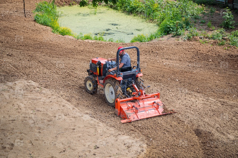 Фермер на минитракторе рыхлит почву для газона. Обработка земли, выравнивание поверхности