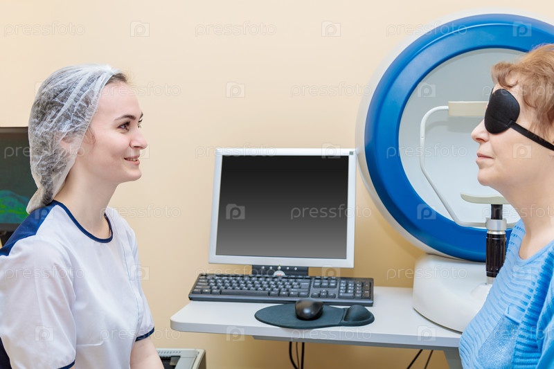 Девушка-оптометрист осматривает глаза пациента с помощью специального современного оборудования