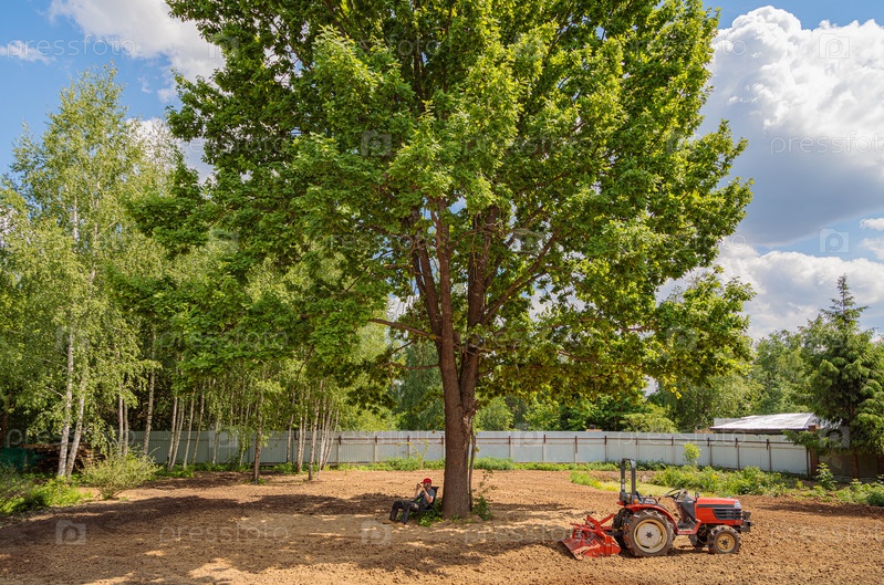 Тракторист отдыхает в тени дерева после вспашки земли. Сельскохозяйственные работы на участке