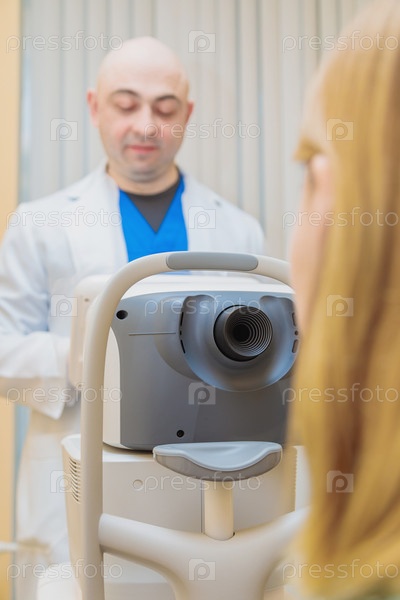 Мужчина-офтальмолог проверяет зрение молодой девушки с помощью современного тестера зрения