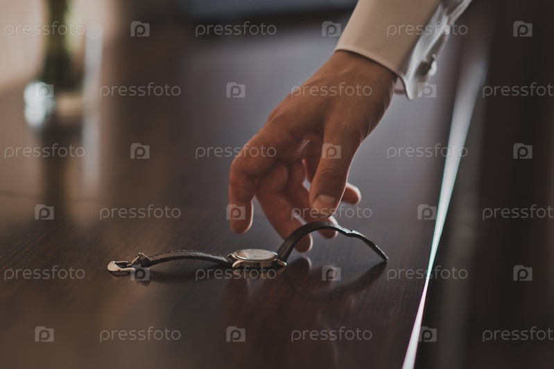 Мужская рука тянется к часам на столе