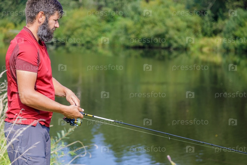 Мужчина с бородой ловит рыбу на реке. Рыбак с удочкой ловит рыбу на берегу реки