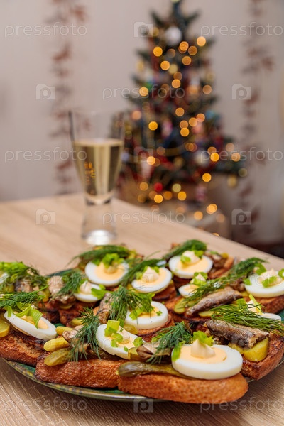 Поджаренный хлеб со шпротами, яйцами и зеленью. Традиционные русские блюда к новогоднему столу