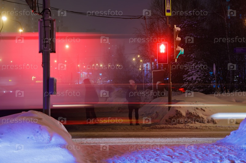 Зимой женщина стоит на светофоре, мимо проезжают машины с включенными фарами. Красный свет горит