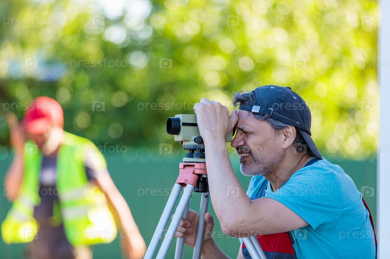 Мужчина работает с оптическим уровнем, чтобы выровнять ландшафт