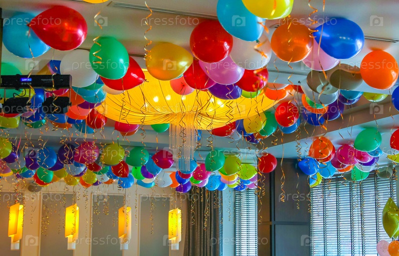 Разноцветные шары вокруг люстры в виде сферы. Украшение к празднику