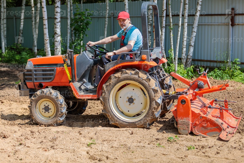 Мужчина на мини-экскаваторе разравнивает участок земли, рыхлит почву