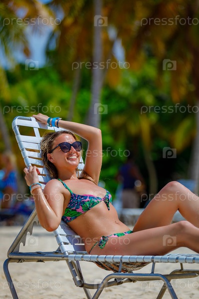 Молодая девушка в купальнике загорает на шезлонге. Счастливый, смеющийся. Фото высокого качества