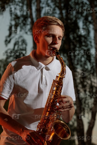 Молодой парень играет на саксофоне вечером на закате