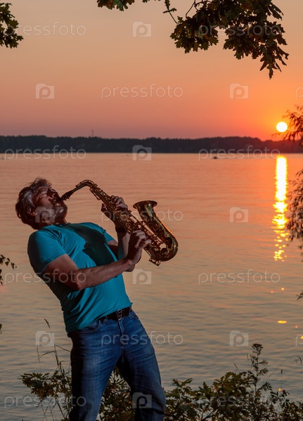 Взрослый мужчина играет на саксофоне на закате у реки вечером