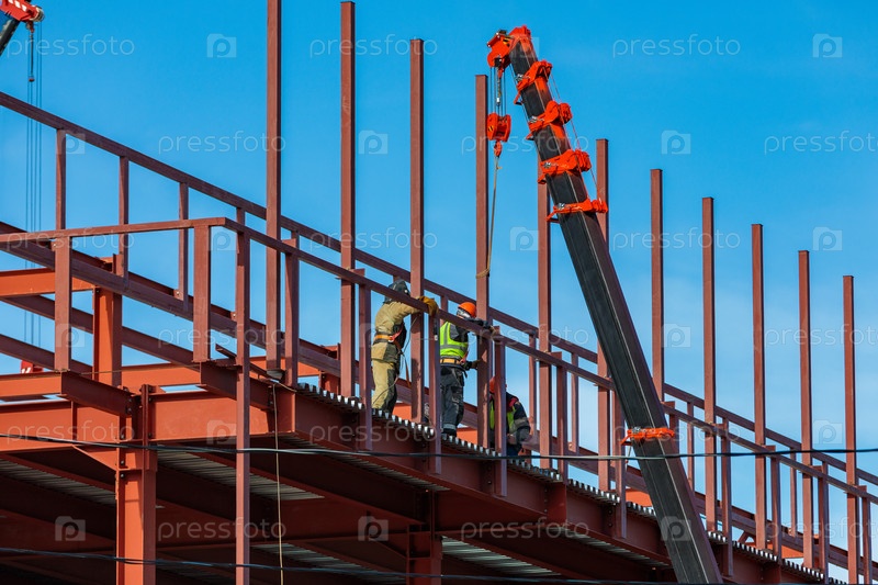 Строители закрепляют железные балки краном. Каркасная конструкция