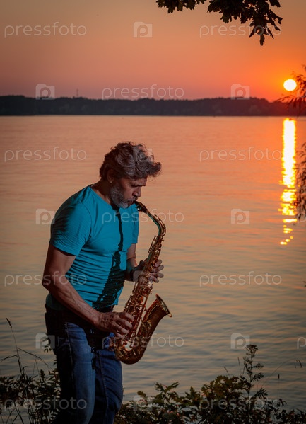 Взрослый мужчина играет на саксофоне на закате у реки вечером